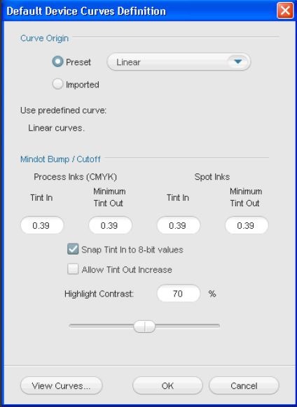 Each device that you add to the device condition will inherit the default device curves and their Mindot settings for its device curves. The Mindot Tint In and Minimum Tint Out values define only the discontinuity of flexo bump or cutoff curves. Above the Mindot, the shape of the curve is defined by preset or imported curves, using the same controls as for other curved device types. You can view the device curve Mindot settings for any device in the Device Curves Definition dialog box.