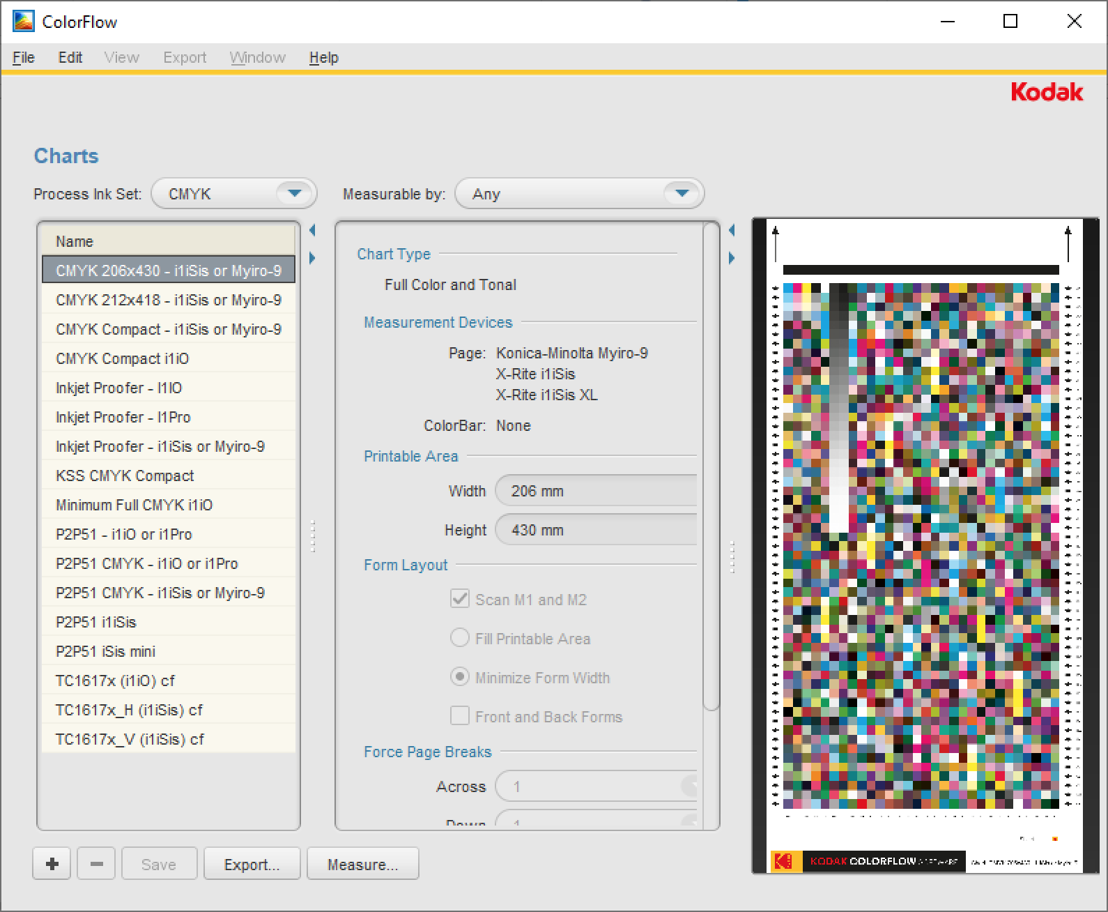 In addition to support KMS environments, ColorFlow Measure can be used to measure charts for Kodak Spotless Software (KSS) and older versions of ColorFlow that do not support the X-Rite i1Pro3, X-Rite i1iO3 and Konica-Minolta Myiro-9 spectrophotometers.