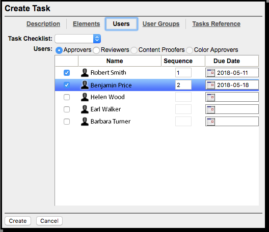 4. On the Users tab and User Groups tab (if any user group is available for the project), select users to add to the task. Optionally, you can assign the Sequence numbers and individual Due Date.