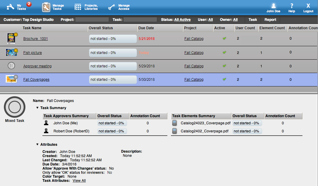 - The Manage Tasks page displays the list of all tasks that you are allowed to view.