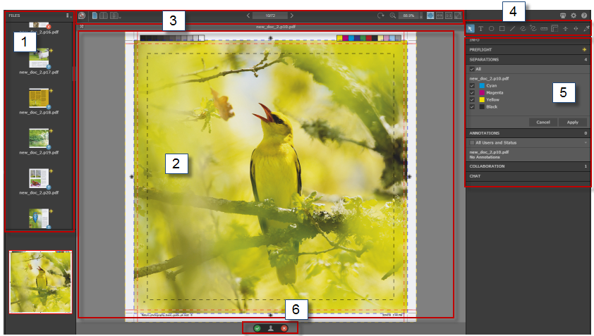| 5 | Information panels (provide detailed information about the file, such as separations and annotation details) |
