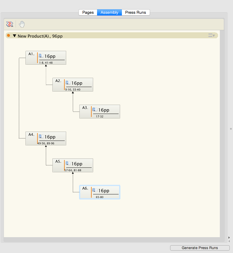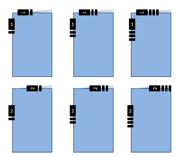 This can be used when your production includes signatures made up from different binding styles—for example, you have two perfect bound signatures that are made up from three saddle stitched signatures each. The perfect bound signatures are the top level and each will get a signature number for the collation mark. The saddle stitched signatures get the same signature number as the parent and a tic line below indicating its number within the parent signature. The image depicts the scenario in the example: the collation marks added with the section assembly.