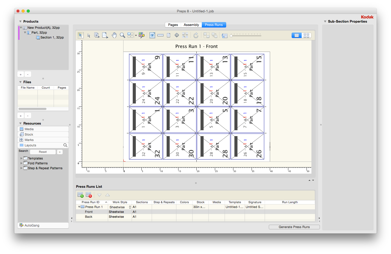 The result is a single Press Run with a single 32-page section and four sub-sections (ribbons). When you select a section on the sheet, the properties pane will display Sub-Section Properties and the properties can be controlled/set independently from the other sub-sections.