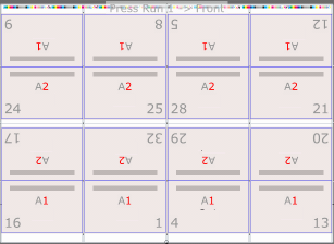 Use this 2-up layout of different sections to produce two stacks of identical books that require fewer plates and less makeready time, compared to 2-up layouts of identical sections. Come-and-go jobs are often printed on web presses and finished on 5-knife trimmers that can cut out two books at once.