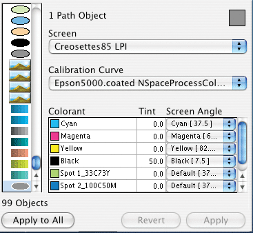 After you select objects that you want to apply screening to, you must apply your choice of screen instance to the selection. You can use the DotShop Properties Editor to change a selected object's screening properties, depending on the options checked in the SIF file for a particular screen instance.