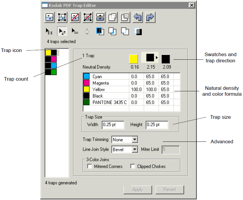 Note: If a selected grouping such as a color pair contains more than one trap, any differing or mixed trap values will be indicated in the Properties Editor/Viewer with an * (asterisk), the Line Join Style list may show as blank, and the toggle button may show a modified check mark. If a grouping contains a least one untrapped border, only the colorant is shown, and other values are disabled.