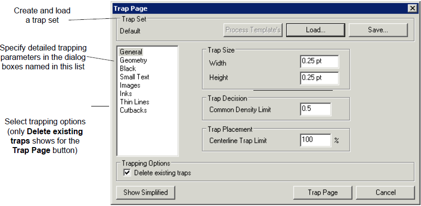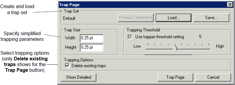 Each trapping dialog box includes three main sections—Trap Set, Trapping Parameters, and Trapping Options. The Trapping Options section is different for trapping a selection or trapping a page.