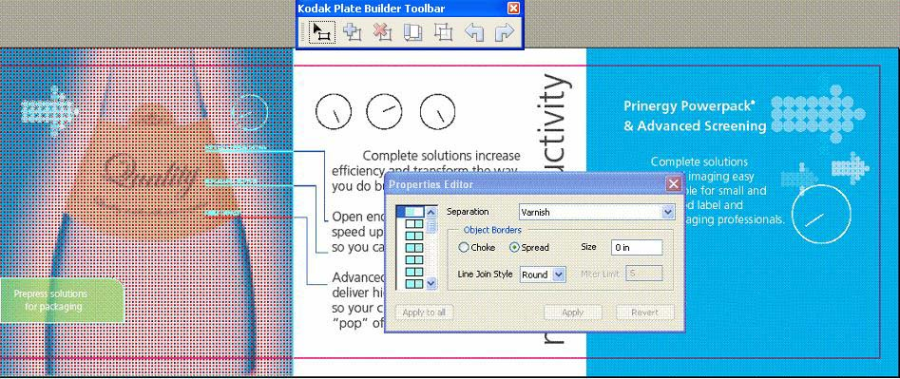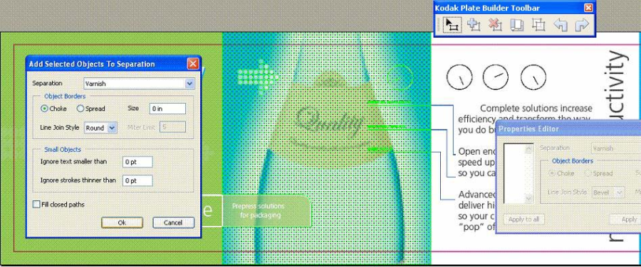 - Click the Add Selected Objects to Separation tool. If the varnish object needs to be spread or choked, set the amount in the Add Selected Objects to Separation dialog box.