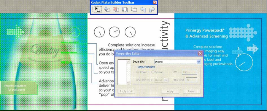 Note: When you start Plate Builder, the Properties Editor dialog box also appears, but you cannot enter settings until you select an object. - Select the objects that you want to add to the varnish plate.
