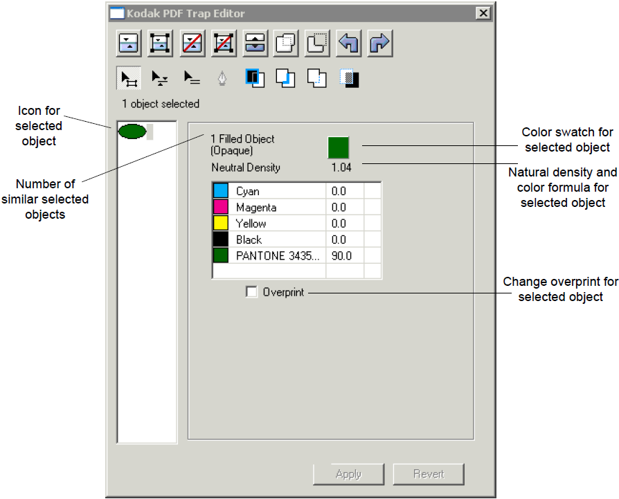 - Select the Overprint check box to set an object to overprint—in effect, floating the object over any other objects, traps, and borders in the page, and making any traps for this object unnecessary.
