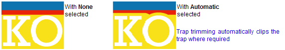 Note: If trap trimming is enabled, the trapping time can be longer, so only use the option on files where it is needed. Use it with caution around overprinted objects, because trap trimming does not ignore overprinted objects. You cannot force two traps to butt against each other underneath a keyline.
