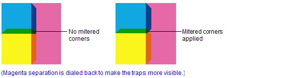 Check Mitered Corners to miter the corners of a trap located where at least three colors meet. This reduces ink buildup at the intersection.
