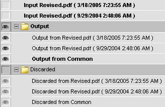 A layer with an eye next to it is displayed; a layer with no eye is hidden. Note that only one main layer (Input <originalfile>.pdf, Input <revisedfile>.pdf, Output, or Discarded) can be displayed at one time, although within the Output layer or the Discarded layer you can display multiple sublayers at once.