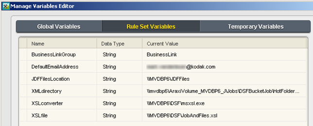 - In the Manage Variables Editor dialog box, click the Rule Set Variables tab, and enter the following values for the variables: