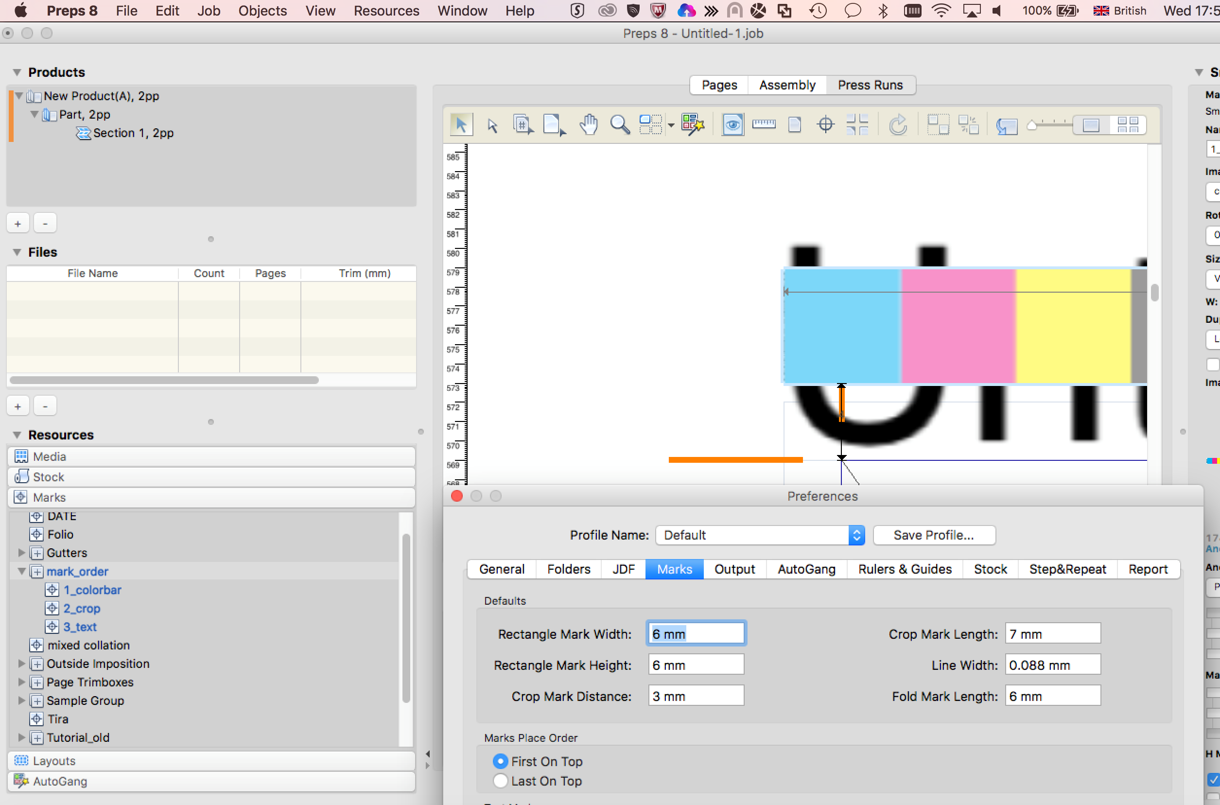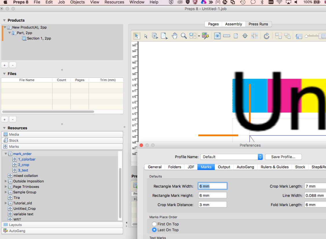 - The first mark added to the press sheet has the lowest file name, and the rest of the marks are added after. The first mark becomes either the top-most or bottom-most mark, depending on the Marks Place Order preference setting.
