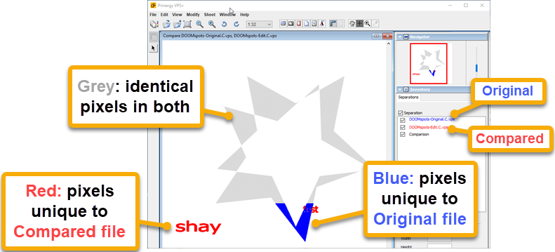 The original file name will be identified in Blue under the Inventory > Separations list, and the compared file name will be identified in Red.