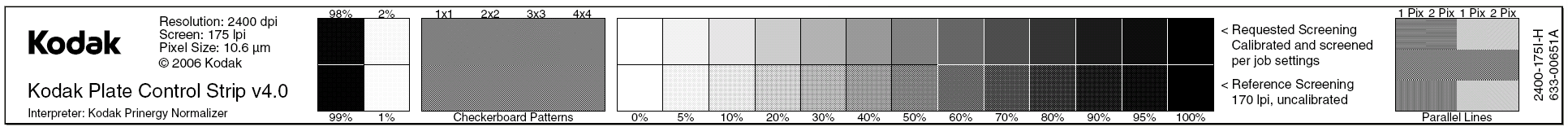 The Kodak Plate Control Strip is a test image for digital platesetting systems. It contains a variety of pixel checkerboards, linework, prescreened areas unaffected by tone curves, and continuous-tone tints.