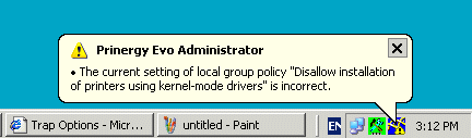Die Prinergy Evo-Software erkennt bestimmte Serverkonfigurationen, die das Programm an einer ordnungsgemäßen Ausführung hindern könnten. Wenn die Prinergy Evo-Software Probleme mit dem Betriebssystem Windows Server 2003 oder 2008 erkennt, wird in der rechten unteren Ecke des Server-Desktops eine Warnung angezeigt. Hier sehen Sie ein entsprechendes Beispiel: