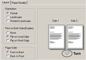 Match the laser printer's duplexing style as follows:- If the paper orientation is set to portrait and the duplex style is set to flip on the long edge, select Turn.