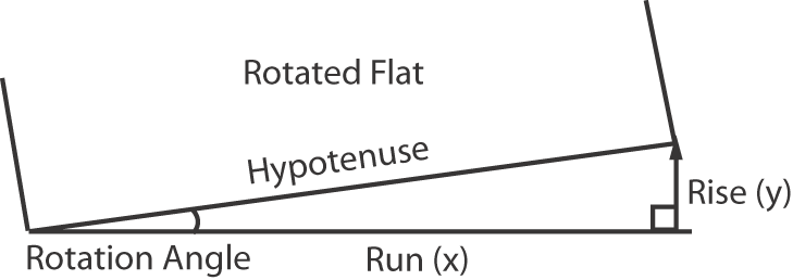 - Run (x-axis): measure the distance along the x-axis from the non-rotated corner of the flat to the point where the vertical line transects the x-axis at a right angle. Example: 90 units