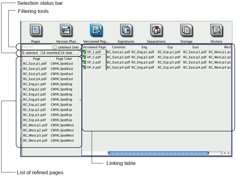 Because you can link multiple pages (pages for a row or column) at one time, use the filtering tools to reduce the number of pages in the list and to help you quickly select the appropriate pages.