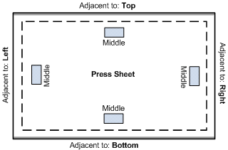 Using these three options, you can place a sheet mark at various positions on a press sheet or plate. Before making your selection, you must know where you want the sheet mark to appear, the size of your press sheet and plate, and the location of the lead and tail clamps. This is particularly important when placing the sheet mark on a plate.