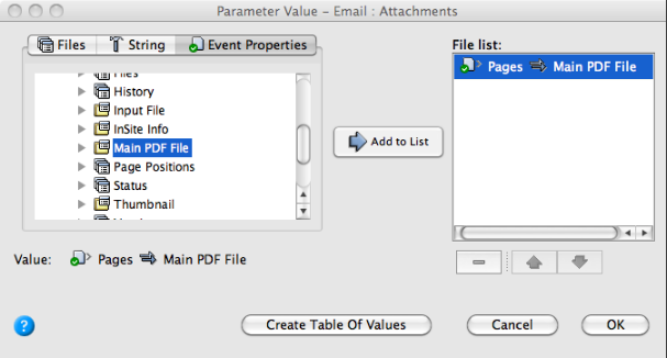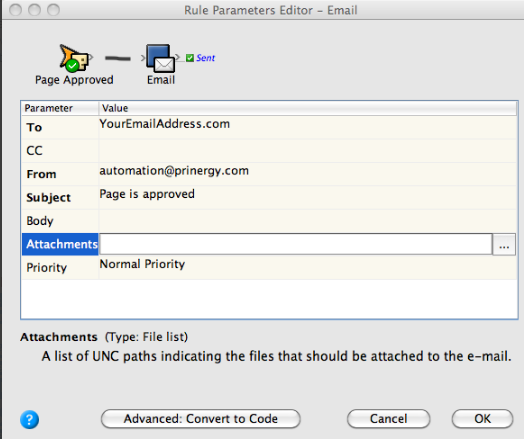 - Select the prepress_operators_emails variable, and click OK. The prepress_operators_emails variable appears as the To parameter. Its format is %$prepress_operators_emails%, where the leading and trailing % characters are used to delimit the value as a property or variable reference and the $ character indicates that it is a global variable reference. When the action executes the value of the global variable will be retrieved passed to the action.