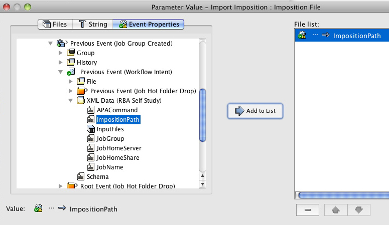 4. Configure the Imposition File parameter to Previous Event (Input File Added) > Previous Event (Job Created) > Previous Event (Job Group Created) > Previous Event (Workflow Intent) > XML Data (RBA Self-study) > ImpositionPath.