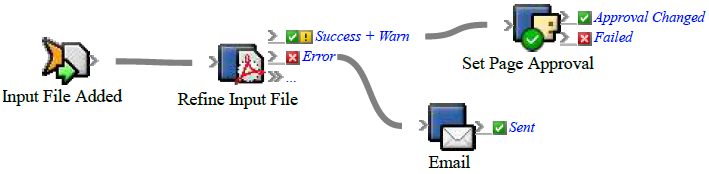 Add multiple actions to the rule by dragging actions to the resulting events of the earlier action. For example, after input files are refined, add a Set Page Approval action to the Success + Warn event that occurs when the refine is successful and add an Email action to the Error event that occurs when the refine has errors.