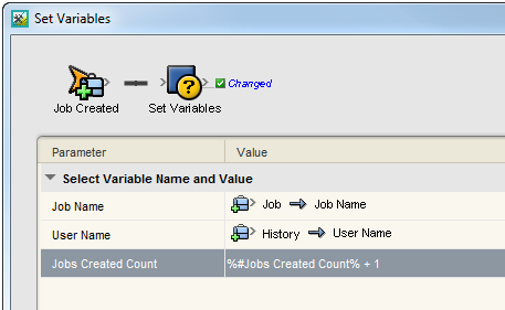 As with all action parameters, the value of a variable can be specified either by assigning it directly or including it in an expression as seen in the example below for the Jobs Created Count rule set variable. In this example, the current value of Jobs Created Count is incremented by one and assigned back to the variable.