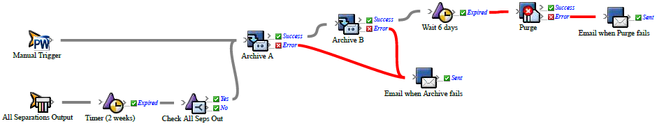 When all final output has been done, wait two weeks, verify all separations have still been output, then archive and purge. Send e-mail messages as appropriate. Also has a manual trigger.