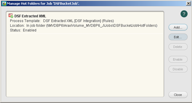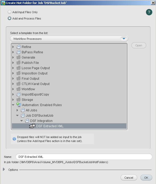 - In the DSFBucketJob job, create a hot folder attached to the DSF Extracted XML rule.