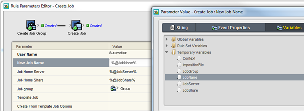In most cases the reference is generated for you automatically. For example, if you assign a temporary variable named JobName directly to an action parameter, the selected variable name is converted to a variable reference string of the form %@JobName%.