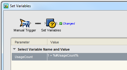 Variable references can also be used as part of expressions. To increment the value of a Rule Set variable named UsageCount, the value is the expression 1 + %#UsageCount%. This expression is evaluated at runtime and the result assigned back to UsageCount.
