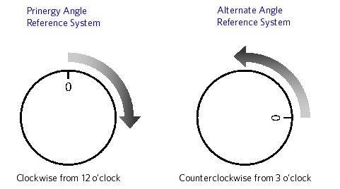 The Prinergy software specifies angles clockwise, starting from a 0° reference point at 12 o'clock. The alternate system specifies angles counter-clockwise, starting from a 0° reference point at 3 o'clock.