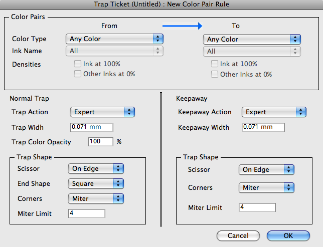 Otras tintas al 0 % Si se selecciona esta opción, las reglas de pares de colores actuales solo afectan a un objeto sin otras tintas. Si no se selecciona esta opción, las reglas de pares de colores actuales solo funcionan en un objeto con otras tintas. | |