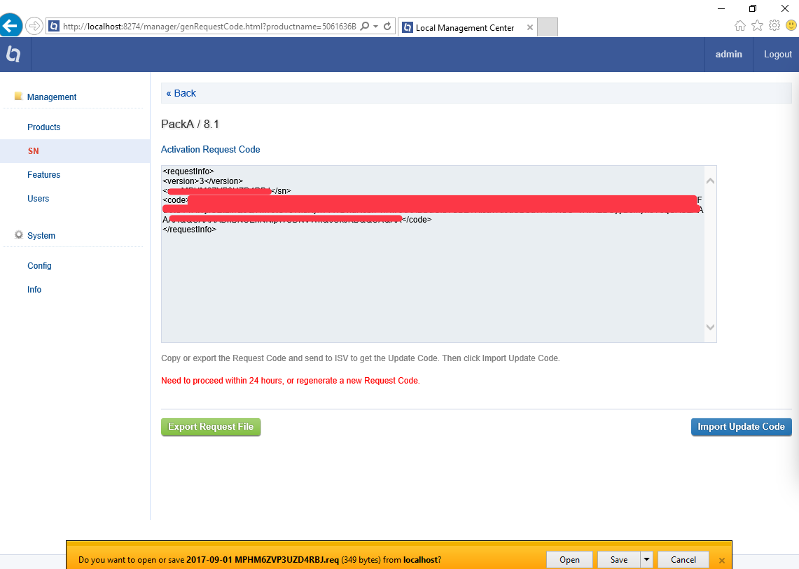 *.req), descargue el archivo de actualización (*upd) y cópielo en el equipo sin conexión a Internet. - En el equipo sin conexión a Internet, en el Centro de administración local, haga clic en Importar código de actualización e importe el archivo