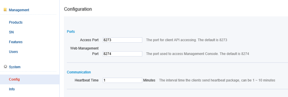 Si el servidor de autorización local cuenta con una dirección IP de Internet, los ordenadores en Internet también pueden utilizar una licencia de servicio local. El puerto de administración web es 8274 y el puerto de acceso de cliente es 8273. Para editar estos puertos, acceda a http://localhost:8274 y haga clic en Configuración.