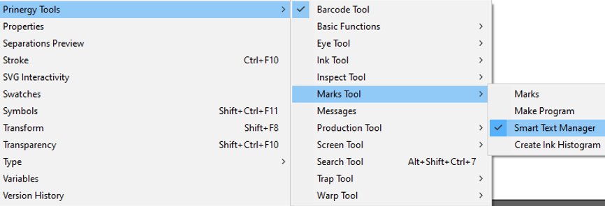 In the Illustrator menu bar, go to the Window menu and select Prinergy > Mark > Marks to open the main window of Marks.