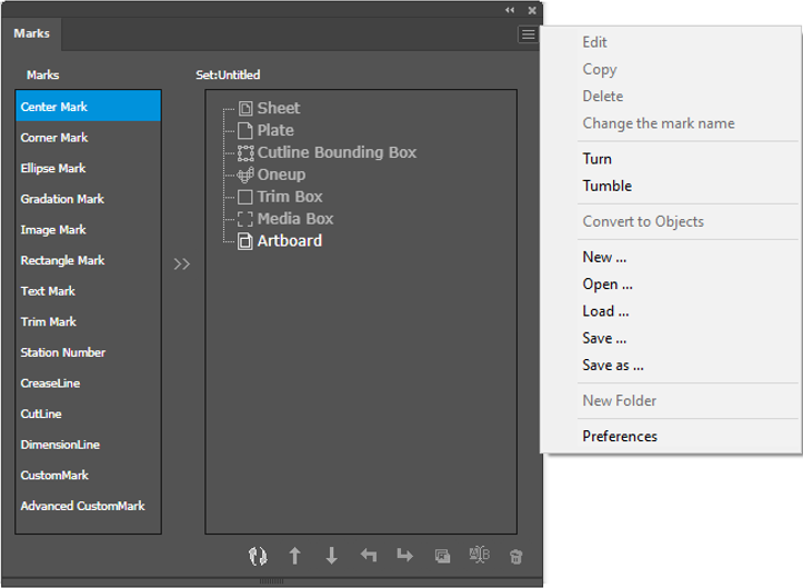 The main interface of Marks enables the addition of marks, editing marks and management of parameter sets of marks within the Illustrator file.