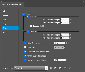Include Solid Check for flat tint objects with a dot percentage of 100%. Gradient Min. Dot Percentage Check for gradient objects which include a dot percentage that is less than the specified minimum dot percentage. Gradient Max. Dot Percentage Check for gradient objects which include a dot percentage that is greater than the specified maximum dot percentage. Min. Object Size Check for objects which are less than the specified minimum object size.
