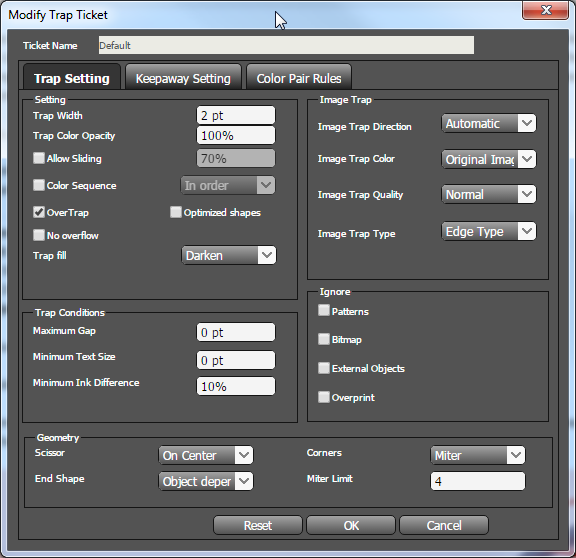 Utilice el cuadro de diálogo de nota de solapado para establecer los parámetros de solapamiento principales, que incluyen los ajustes de solapamiento y alejamiento, y para establecer las reglas de solapamiento de pares de colores. El nombre predeterminado del archivo de nota de solapado es untitled.