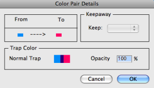 After selecting a trap color pair, double-click the trap color pair or select Show Details from the side menu of the Trap Color Pairs dialog box to make the Show details dialog box appear. This dialog box displays the details of the trap color pairs. From and To indicates the direction of the trap color pair. Trap Color uses a graphic to indicate Normal Trap and Opacity is used to set the opacity percentage of the trapping area. When you use the Keepaway trap, the Keep parameter is used to set which color should be kept without change. Keepaway trapping allows control of specific inks and you can limit keep away to specific colors.