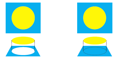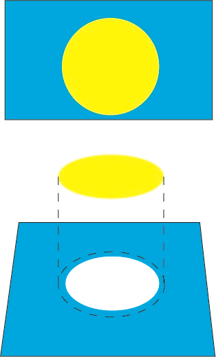 Normal Trap: The lighter color spreads into the darker color. As shown in this image, the circular object overlaps the square object. Because the fill of the circular object is a lighter color, standard trapping procedures dictate that the foreground object should be spread into the dark background object to maintain the visual edge.