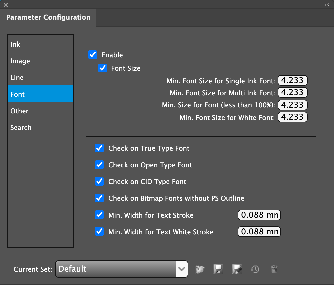 Check for fonts in objects that are less than the specified minimum font size for Single Ink Font, Multi Ink Font, fonts with specified inks that are less than 100%, and White Font (fonts without filling with any color).