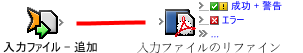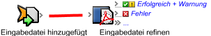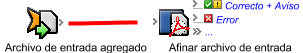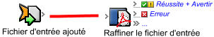 For example, in Prinergy Actions > Input File Actions, drag Refine Input File to the Action icon. The new action replaces the placeholder icon. The connector is still red, which indicates that the rule needs more information before it will work (a required parameter is not set). For example, in the Refine Input File action, you must identify which process template it uses to refine the input files.