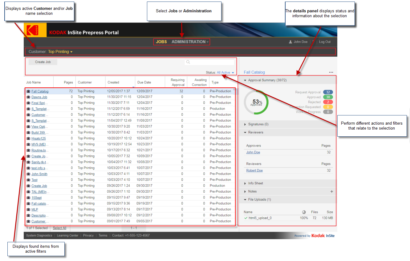 If you have used previous versions of InSite Prepress Portal, you’ll quickly forget that you needed to switch between several different windows and dialog boxes. You’ll find it easier and faster to do your work, using a single window to review pages, upload jobs, approve or reject pages, and interactively edit the properties of job elements.